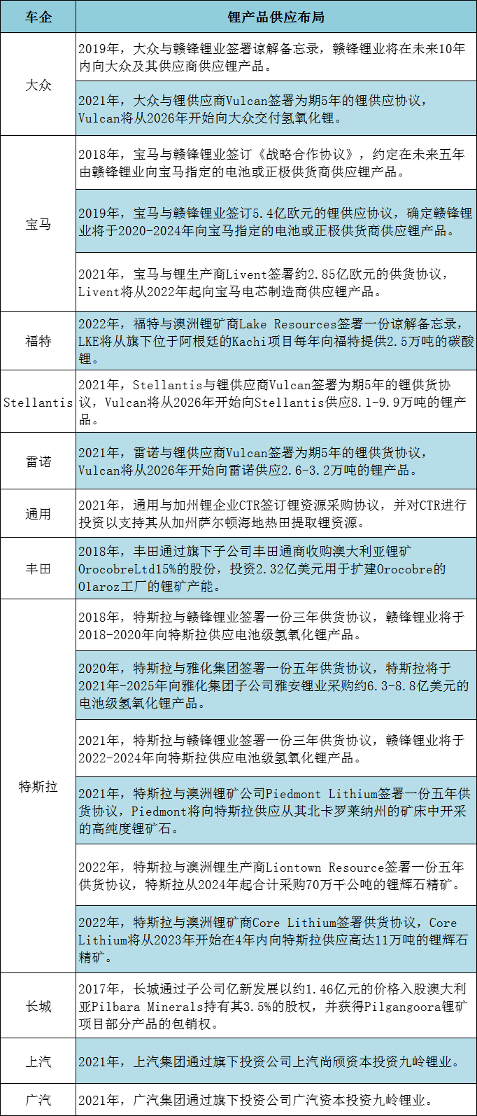 在此情況之下,越來越多主機廠開啟“尋鋰”之路,并在鋰鹽/鋰精礦供應布局方面絲毫不遜色與上游鋰鹽企業(yè)、正極材料企業(yè)和電池廠,成為爭奪全球鋰資源的重要參與者。