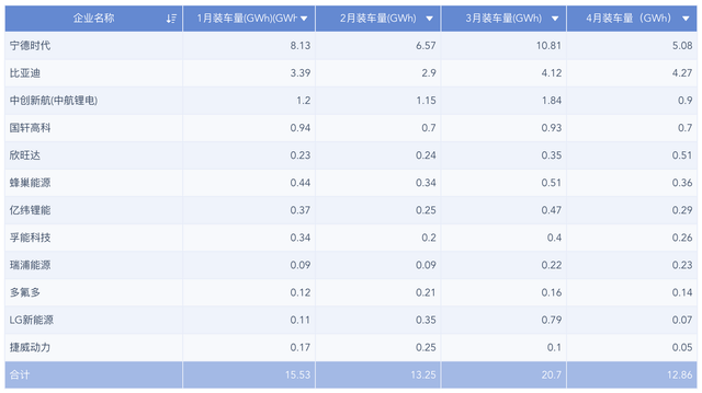 ▲表1. 1-4月主要動力電池的企業