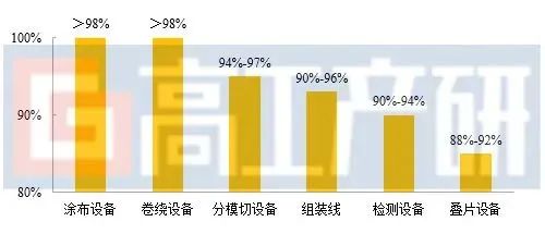 根據鋰離子電池的生產工序,鋰電設備主要分為前段、中段、后段三大工序。前段設備主要是指電芯制片工序,包括攪拌、涂布、輥壓、分條等關鍵工序,中段設備主要是指電芯裝配工序,涵蓋入殼機、注液機、封口焊接等鋰電設備,后段設備主要是指化成、分容等工序。近幾年在政策及市場推動下,國內鋰電設備企業研發投入增加,技術水平得到快速提升。目前國內鋰電設備與國外先進設備在自動化、工藝精細度水平上已逐漸接近甚至超越國外設備,帶動鋰電設備國產率大幅上升。GGII數據顯示,2021年鋰電設備國產化率達85%以上,預計在新一輪的動力電池擴產周期中,國產鋰電設備占有率將進一步提升。
